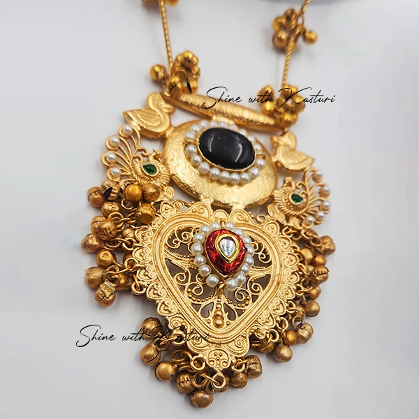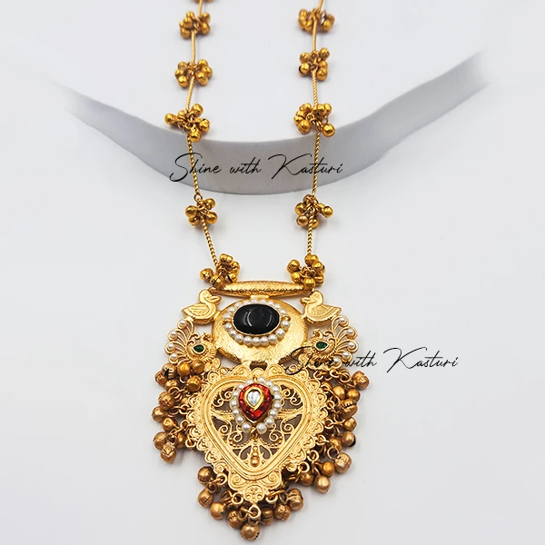 Aarvi Antique Long Necklace with Kundan, Stones & Motifs beautifully combined tradition in an elegant style. Featuring an intricately crafted pendant adorned with a bold stone, green accents, and a large ethnic pendant, this necklace radiates regal charm. The gold-toned finish with dangling beads adds movement and richness, making it a standout piece for weddings, festivals, or special occasions