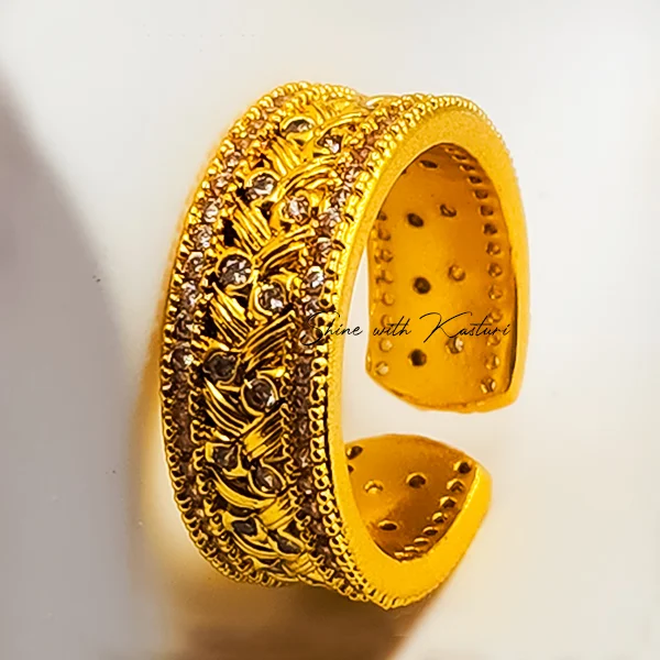 Antique gold adjustable ring showcases fine craftsmanship with a beautifully detailed woven pattern set with CZ stones. The open adjustable design ensures comfort and a perfect fit. Ideal for ethnic, festive, or bridal occasions, this ring adds a timeless elegance to any look.