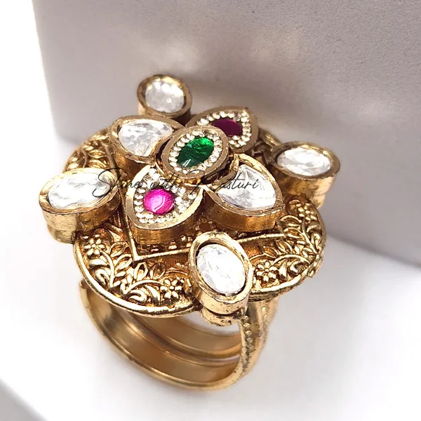 Buy Antique Royal Kundan Ring, beautifully crafted with intricate detailing and a luxurious gold-tone base. The centerpiece features striking ruby and emerald accents, surrounded by sparkling white Kundan stones set in a floral-inspired design. The handcrafted artistry and embossed base add to its regal charm, making it a true heirloom piece.
