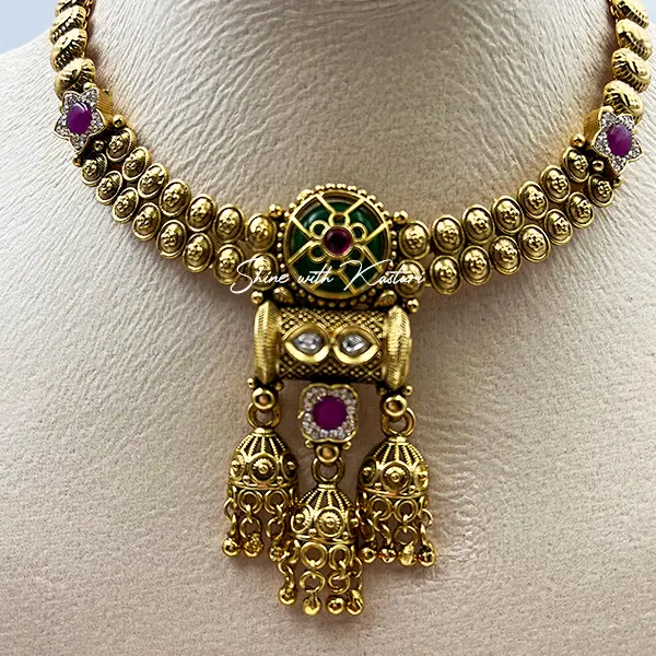 Three ornate gold jhumka-style danglers complete the design, adding movement and a regal touch. Perfect for weddings, festive occasions, cultural events, and bridal ceremonies, this necklace embodies luxury, craftsmanship, and traditional artistry.