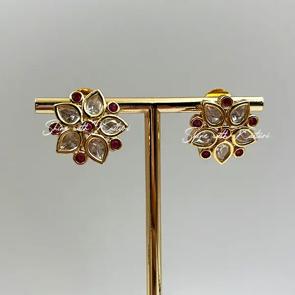 This elegant Kundan necklace set is beautifully handcrafted with high-quality mirror-finish Kundan stones paired with rich ruby red accents. Designed with a traditional Indian aesthetic, the necklace comes with matching floral stud earrings that add extra charm to any festive or wedding outfit. The golden polish and intricate detailing make it perfect for brides, bridesmaids, and women who love ethnic jewelry. Ideal for weddings, parties, festivals, and special occasions.