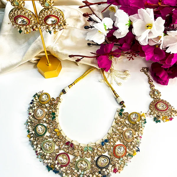 Multicolor Kundan Statement Necklace with Bead Detailing is a masterpiece of traditional craftsmanship. Featuring sparkling stones, vibrant colored accents, and delicate beadwork, it brings elegance and festivity to any attire. Designed to complement weddings, festivals, and cultural celebrations, this necklace adds a royal touch while remaining lightweight and comfortable.
