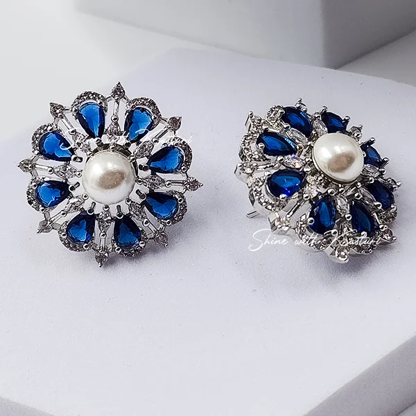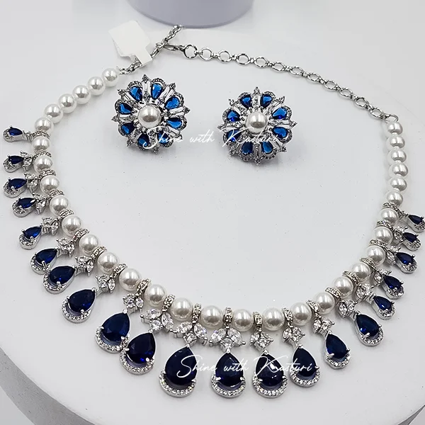 AD Layered Necklace is an elegant choker style adjustable AD Necklace with CZ, Pearls & Stones. This American Diamond Necklace is an impressive piece of jwellery with stunning combination of white pearls, blue colour stones and petal shaped rhinestones. The Pearls & Cubic Zirconia Layered Necklace has an extra ordinary design with brilliance to get you shining with your costume at any occasion.