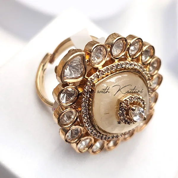 Add a regal charm to your jewelry collection with this Royal Kundan Teardrop Enamelled Ring, a luxurious piece of craftsmanship designed for elegance and grace. The centerpiece features a teardrop-shaped enamel base with a dazzling white stone in the center, surrounded by radiant Kundan stones and delicate crystal accents.