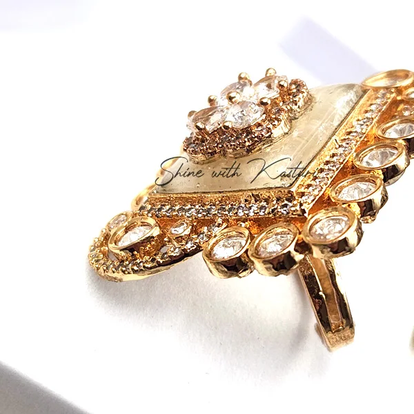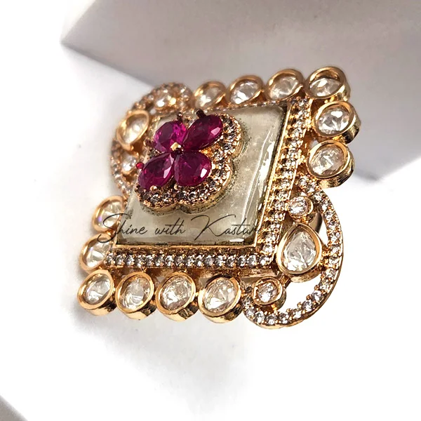 Royal Kundan polki ring in Square Enamelled Ring, a stunning masterpiece of traditional craftsmanship and modern elegance. The centerpiece features a radiant ruby floral design, set against a polished enamel square and bordered with shimmering white Kundan stones. The intricate detailing and luxurious gold-tone finish make this ring a true statement piece.