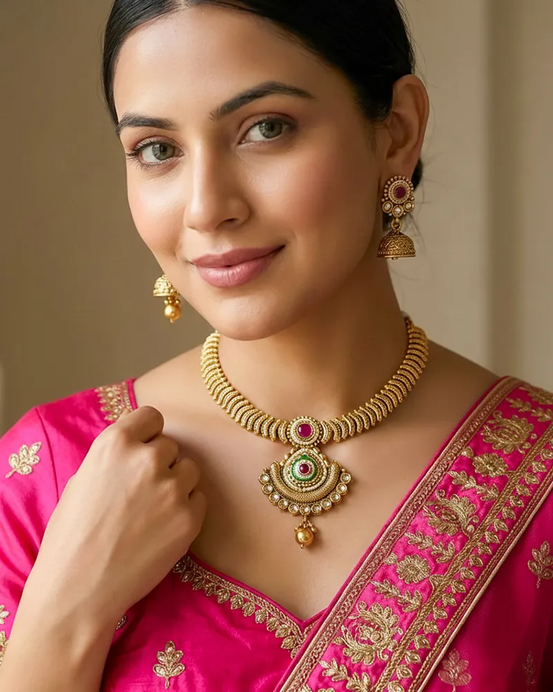 This kundan & Stone Necklace with Jhumkis feature a beautifully crafted stone and meenakari on pendant. The choker-style necklace is perfect for weddings, festivals, and special occasions. The matching jhumka earrings complete the regal look, making it an ideal choice for wedding and special events.