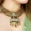 Aarohi Emerald Kundan Necklace Set is a timeless blend of royal elegance and traditional craftsmanship. Designed with a graceful line of teardrop kundan stones, the necklace features a striking emerald green centerpiece framed in antique gold tones. Finished with delicate pearl drops and matching earrings, this set is ideal for brides, wedding functions, and luxurious festive celebrations.