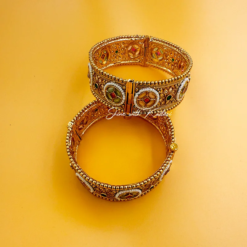 Add a touch of regal elegance to your ethnic ensemble with these Antique Gold-Plated Kundan Meenakari Kada Bangles. Designed with detailed Kundan stone settings and colorful Meenakari enamel work, these bangles showcase the richness of traditional Indian artistry.
