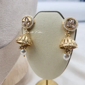 The antique gold finish adds a regal and timeless appeal, making it perfect for brides and special occasions. The set comes with beautifully designed matching jhumka earrings that complete the classic ethnic look.