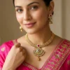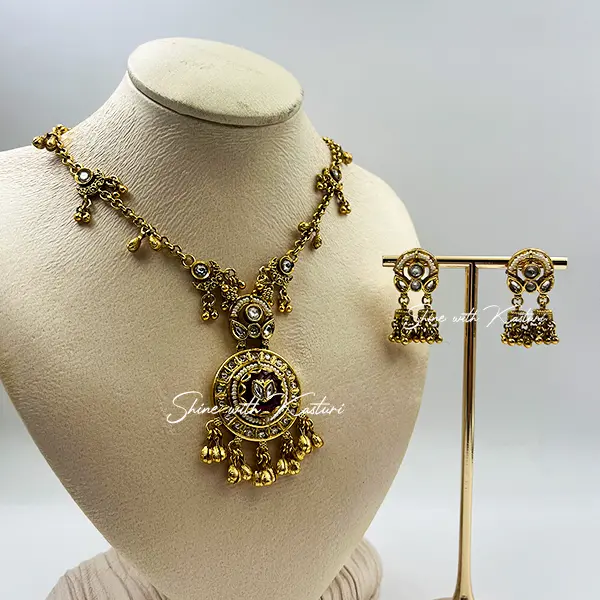 Ethnic look with this Antique Circular Motif Gold-Plated Kundan Necklace & Jhumka Set. The necklace features an intricate chain design adorned with mini dangling beads and sparkling kundan stones. Its grand circular pendant, embellished with detailed motifs and clustered ghungroo drops, adds a rich traditional charm. Complemented by matching chandbali-style jhumka earrings, this set is perfect for weddings, festive celebrations, cultural events, and bridal wear. A timeless piece that pairs beautifully with sarees, lehengas, and designer ethnic outfits.
