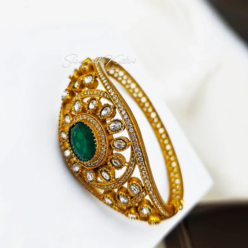 The antique gold plating lends a heritage finish, making it an ideal accessory for weddings, festive celebrations, and special occasions. Designed to stand out, this bangle pairs beautifully with sarees, lehengas, and ethnic ensembles while adding a luxurious touch to your look.