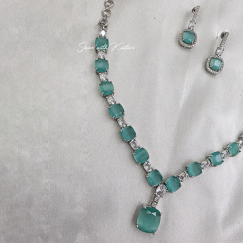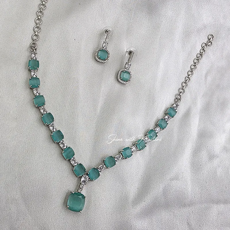 The necklace is thoughtfully crafted with a graceful drop pendant that creates a flattering neckline, while the matching earrings complete the look with understated charm. Ideal for weddings, festive occasions, or evening events, this set blends modern sophistication with timeless beauty.
