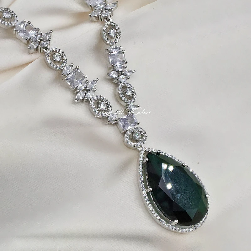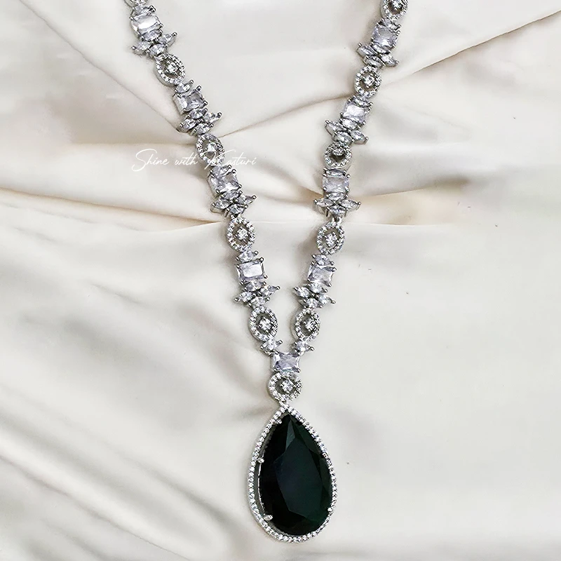 Grace your neckline with the refined beauty of the Celeste Pear Drop Necklace Set. Designed to captivate, this set showcases a delicate arrangement of pear-shaped American Diamonds that shimmer with every movement. The necklace is paired with matching earrings, creating a harmonious look that’s ideal for weddings, receptions, and special occasions.