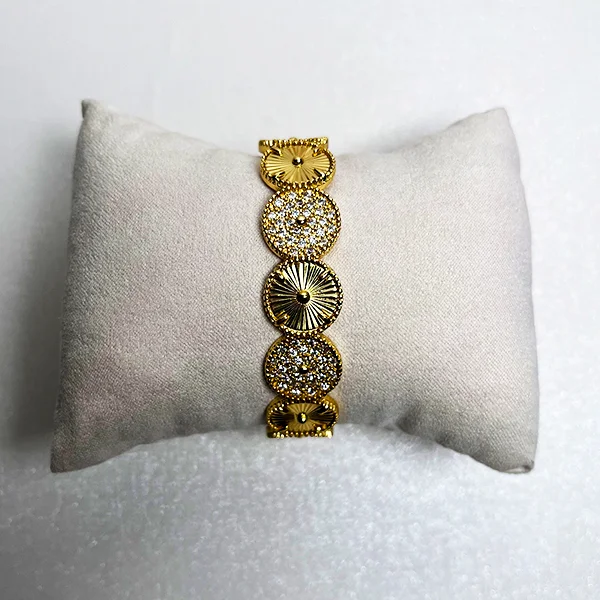 The Lunaria Diamante Gold Bracelet is crafted with refined artistry, blending delicate design with sparkling brilliance. Perfect for gifting or personal style, this designer piece from Kasturi & Co. brings sophistication and standout charm to any jewelry collection.
