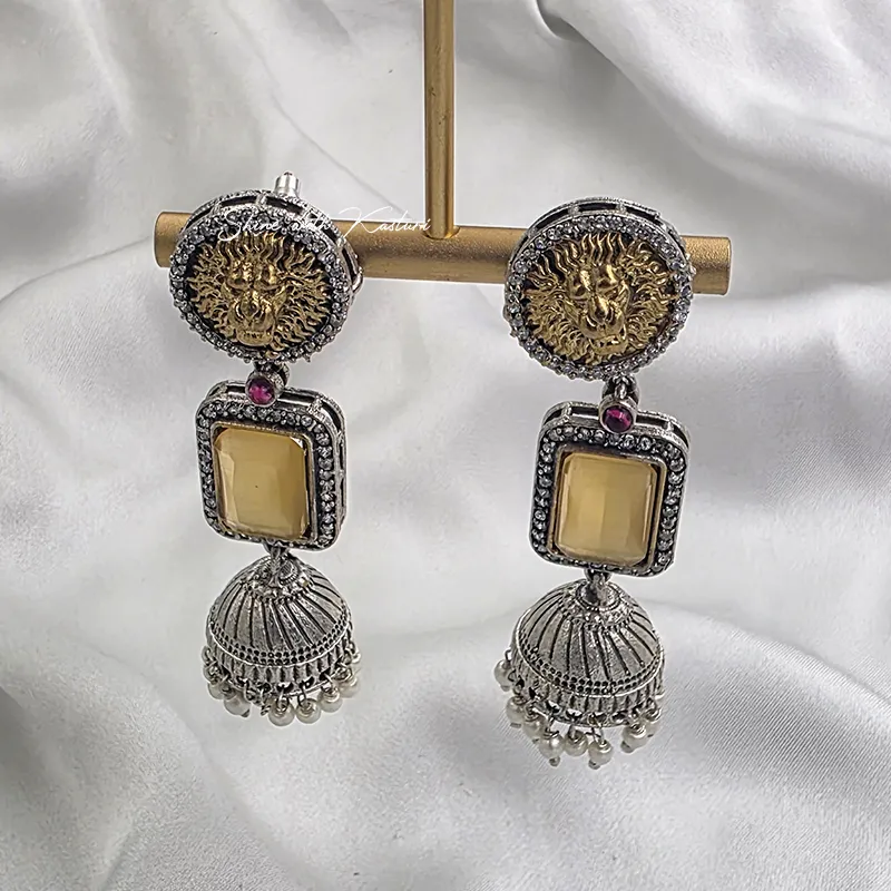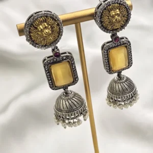 The design is enhanced with a radiant citrine-colored square stone, framed with delicate detailing, leading to a classic dome-shaped jhumka adorned with tiny pearl drops for graceful movement. The combination of oxidized silver and gold tones adds a rich, antique charm, making these earrings perfect for both traditional and contemporary styling. Ideal for weddings, festive occasions, and cultural celebrations, these statement earrings effortlessly elevate any ethnic outfit.