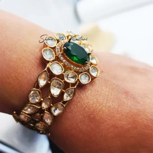 Kundan Stone Bangle with green stone shows craftsmanship and traditional allure. Set in a rich gold-tone frame, this bracelet highlights a captivating emerald-green stone at its center, encircled by brilliant Polki gemstones that reflect sophistication and grandeur. The intricate openwork design ensures both elegance and comfort, making it perfect for festive celebrations, bridal ensembles, or statement ethnic wear.