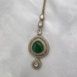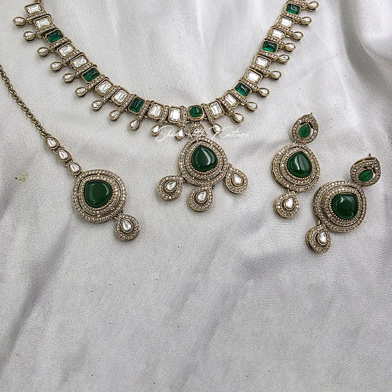 The centerpiece showcases a bold emerald teardrop pendant surrounded by shimmering stones, enhanced with delicate hanging accents that create graceful movement. The set is complemented with matching earrings and a coordinating maang tikka, completing your traditional ensemble effortlessly. Designed for both style and comfort, it offers a luxurious look without compromising on wearability.
