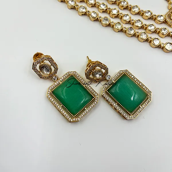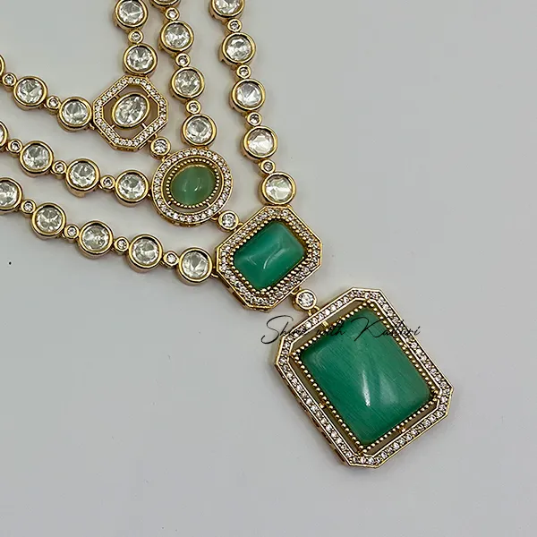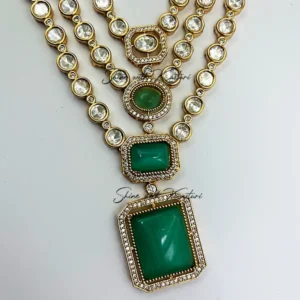 Emerald Triple-Layer Stone Kundan Necklace. Designed with premium craftsmanship, the necklace features: Three layers of sparkling Kundan stones set in a gold-finish frame, Bold emerald green center stones in geometric shapes for a standout, modern-traditional appeal. Perfectly coordinated design suitable for weddings, receptions, engagements, festivals, and special occasions.