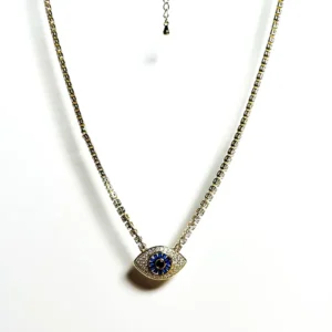 Evil Eye Tennis Necklace featuring a sleek design and fine craftsmanship with a premiu plating. A perfect choice for daily wear or special occasions with a designer evil eye pendant. This piece blends traditional charm with modern elegance andlooks stand out wherever you go. Available exclusively at Kasturi & Co.