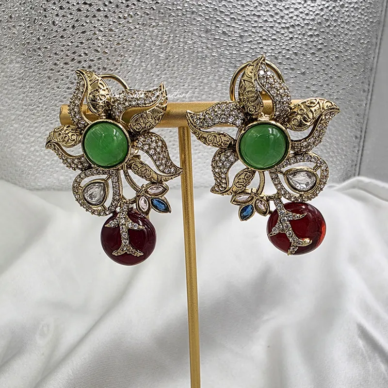 The delicate floral motif is beautifully enhanced with detailed gold-tone work and shimmering accents, while the rich ruby-colored drop adds a bold and graceful finishing touch. Subtle hints of blue stones further elevate the design, making it a unique and eye-catching piece. Perfect for weddings, festive occasions, or special celebrations, these statement earrings pair effortlessly with both traditional and fusion outfits.