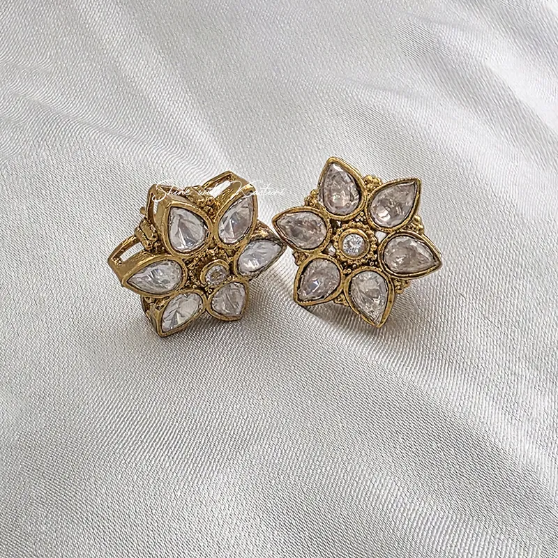 Gold Kundan Floral Stud Earrings, designed to bring a touch of tradition and sophistication to your look. Crafted with precision, these earrings feature a beautiful flower-inspired design made with teardrop-shaped kundan stones arranged in a radiant pattern.