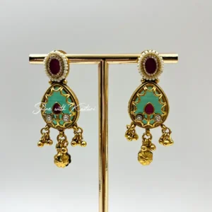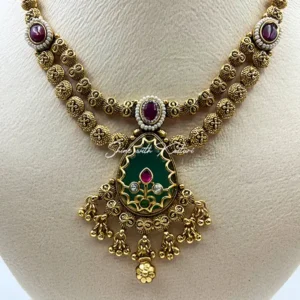 Thie green double-Layered pendant Set offers a unqiue blend of heritage and elegance. This handcrafted jewelry set features a double-layered gold bead necklace with a striking central pendant, embellished with green , pink stones, and intricate detailing. The matching earrings mirror the pendant’s design, complete with dangling gold elements that add movement and charm. Perfect for weddings, cultural events, and festive celebrations, this set embodies the richness of South Asian artistry and timeless beauty.