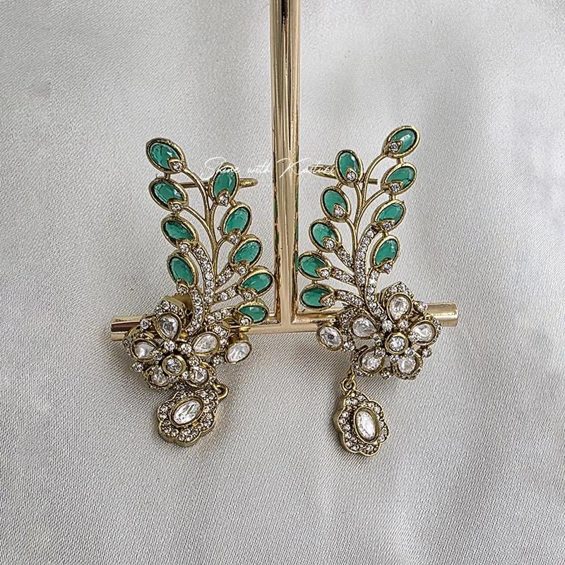 Green Leaf Polki Dangle Earrings with Floral Crystal, with a graceful upward leaf motif, these earrings feature vibrant green stones delicately set in a gold-tone frame, creating a fresh and luxurious look.