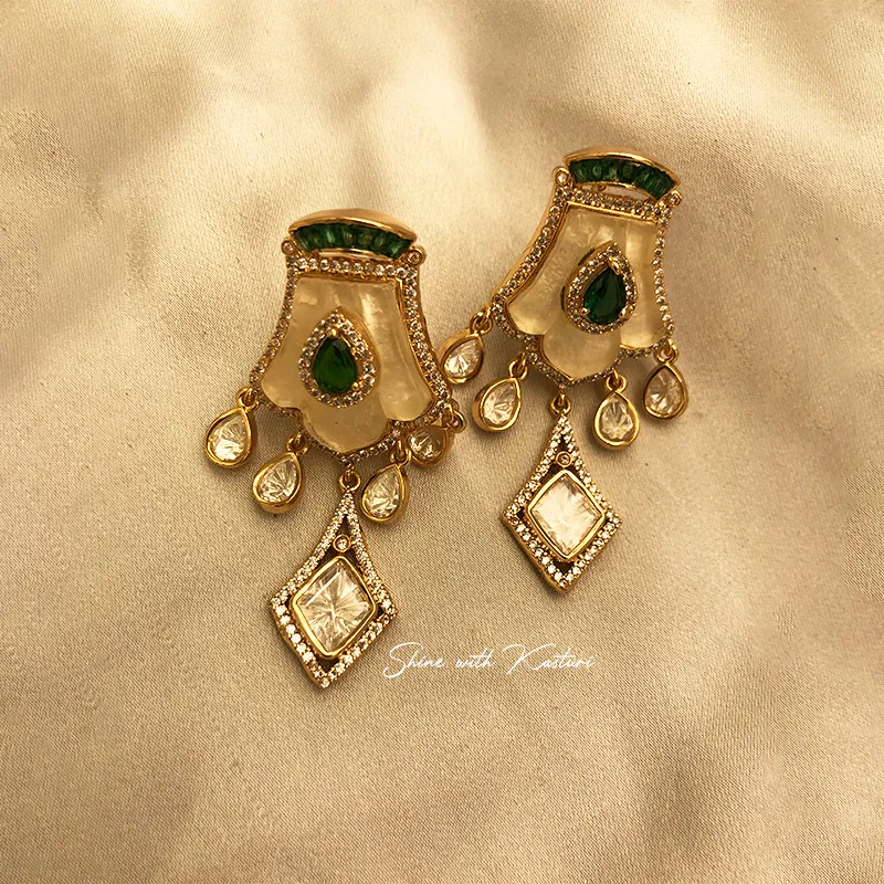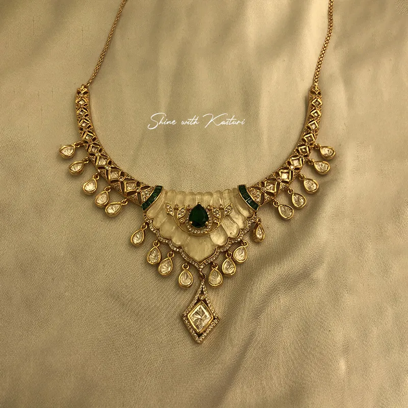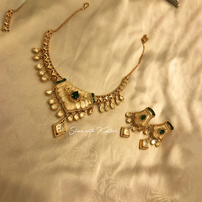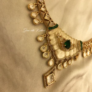 At the center lies a rich green stone accent, adding a touch of regal contrast to the delicate ivory base. The intricate Kundan craftsmanship is beautifully complemented by dangling teardrop elements that enhance the overall movement and elegance of the piece. Ideal for brides, bridesmaids, and festive occasions, this necklace set pairs beautifully with sarees, lehengas, and Indo-western outfits for a refined and elegant style.