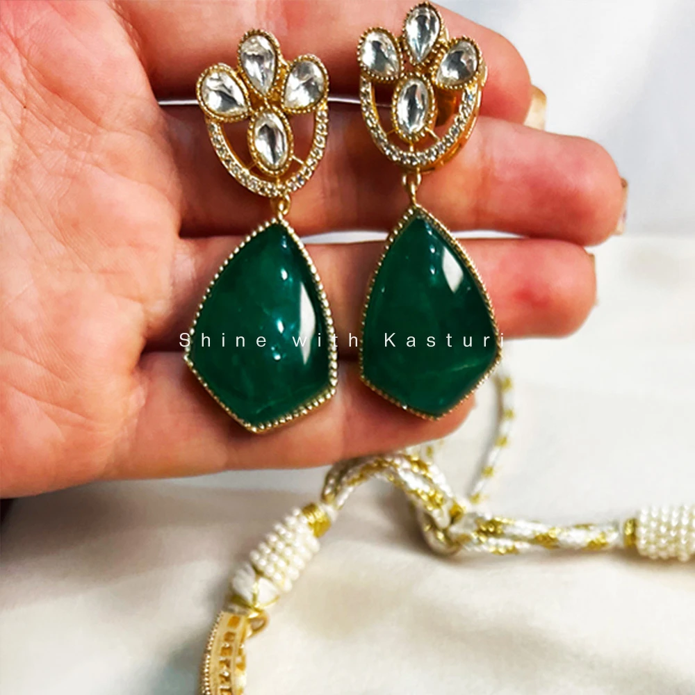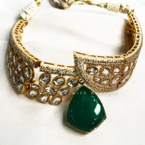 This Stylish Indian Choker with green color stone is a must have in your jewelry collection, and surely will charm everyone with its shape and design. The choker is embellished with polkis and adorn a styish stone pendant in the center. The matching stine earrings complement the choker very well and enhance the beauty of the person wearing it.