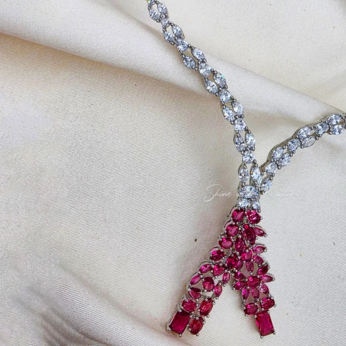 Joyelle is a special ocassion necklace set in Lariate style with Cubic Zirconia in a very unique setting. Thie necklace is a show stopper necklace set that ilooks elegant with any type of outfit and looks elegant and graceful.