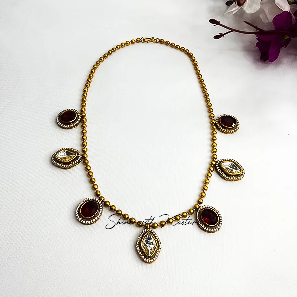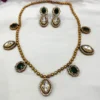Kayla Antique Finish Necklace with Stones is a perfect blend of heritage design. Crafted with precision, this piece features an antique gold finish enhanced by sparkling stones that add a regal touch. The intricate detailing reflects traditional artistry while maintaining a versatile charm suitable for both modern and ethnic attire. Whether worn for weddings, festive gatherings, or cultural celebrations, this statement necklace elevates your ensemble with elegance, grace, and classic allure.