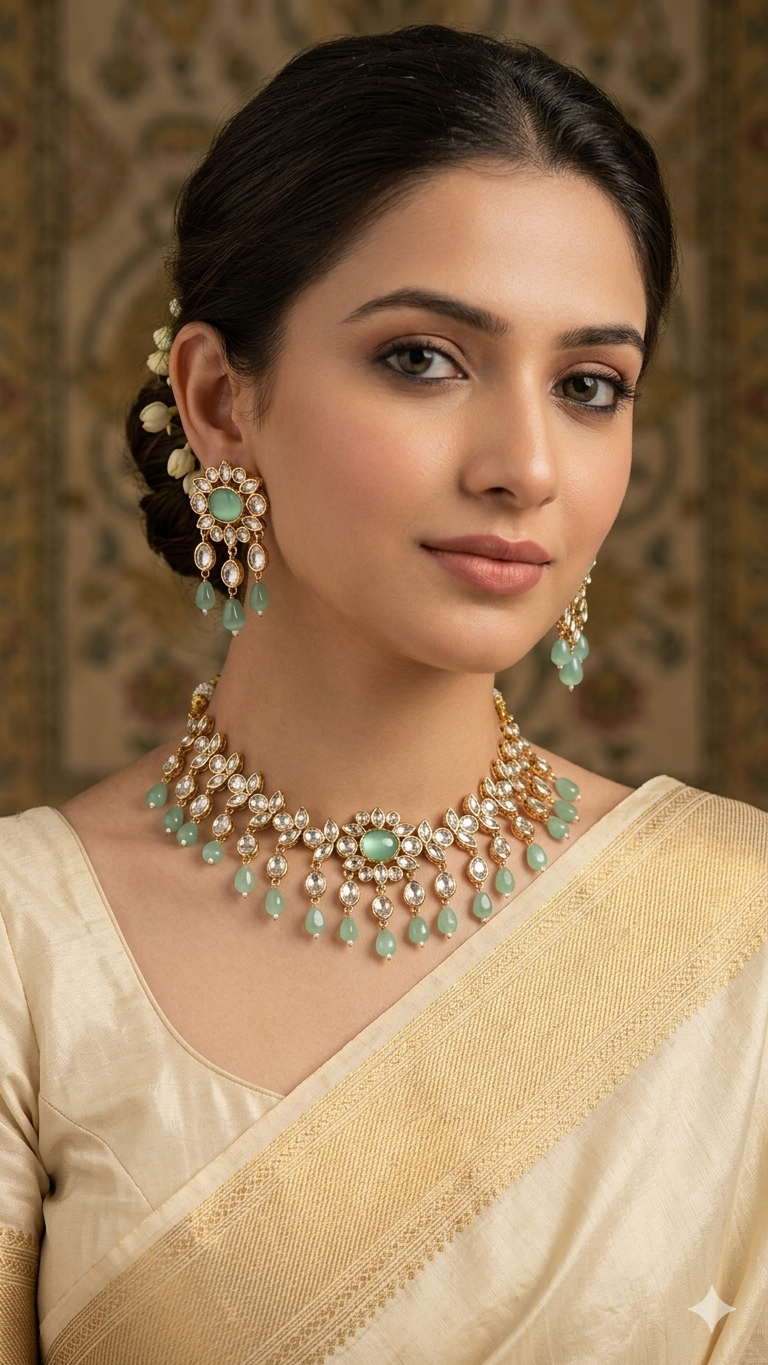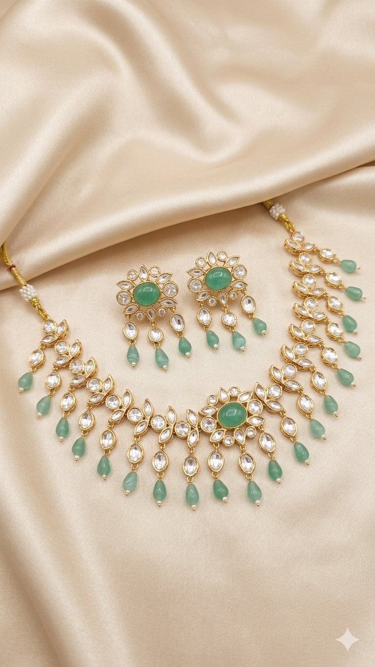 Add a touch of classic elegance to your ethnic look with this elegant Kundan Gold-Plated Necklace and stud drop earrings. Designed with intricately carved floral shape pendant and earrings, this gold plated kundan choker necklace with shimmering kundan stones is a statement in itself. This necklace has a traditional charm similar to that of an original gold necklace with matching earrings and beautifully detailed stud with drops. The choker spread makes it perfect jewelry for Indian weddings, festivals, parties, and traditional celebrations. A timeless piece that enhances sarees, lehengas, and other ethnic attire.
