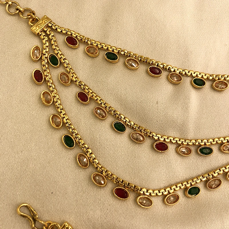Adorned with finely set kundan stones highlighted by rich ruby and green accents, the design reflects timeless craftsmanship and heritage charm. The cascading layers sit gracefully along the hairline, complementing your earrings while adding a regal touch.
