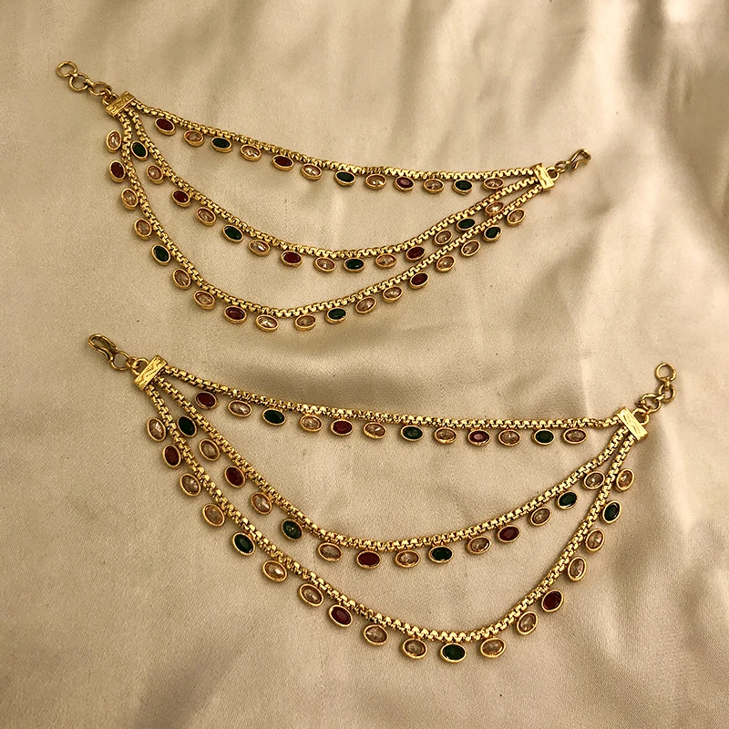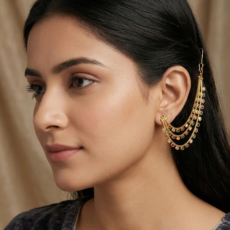 Layered Kundan Multi-Strand Ear Chain, designed to bring elegance and grandeur to your ensemble. Featuring multiple delicate strands, this piece creates a beautifully layered drape that adds depth and sophistication.