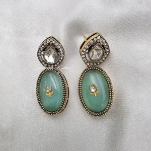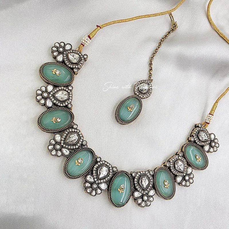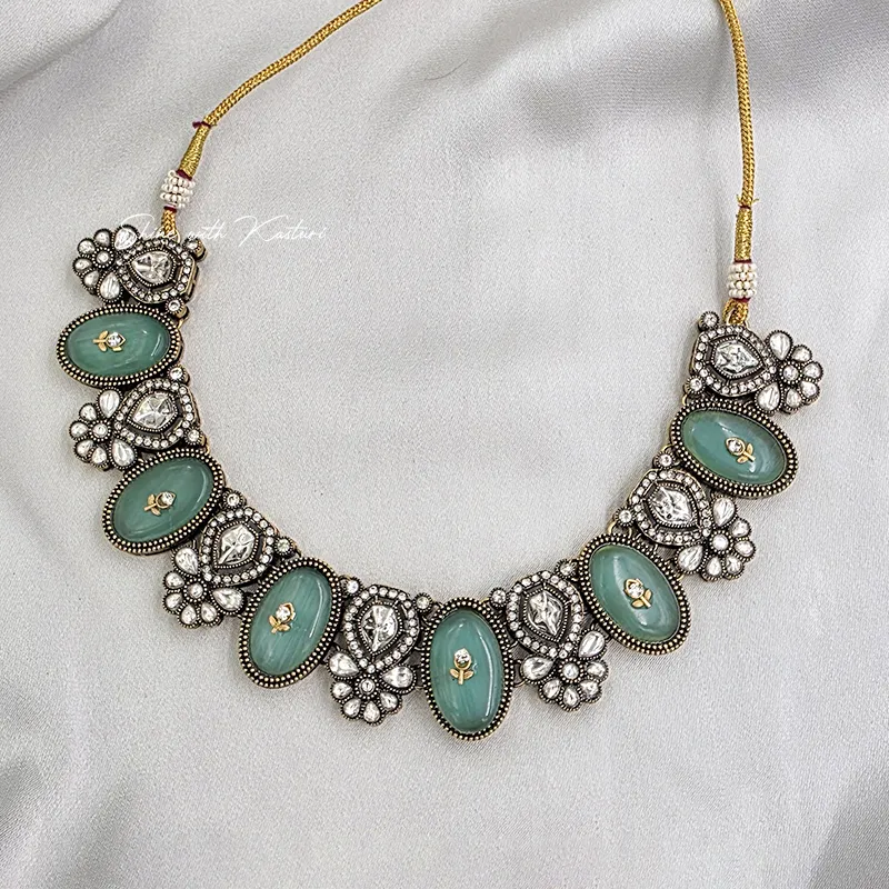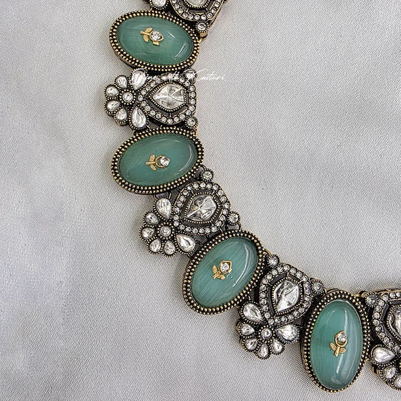 Mint Kundan Statement Necklace Set, designed to reflect timeless elegance and craftsmanship. The necklace features beautifully set oval mint stones surrounded by intricate floral Kundan work, giving it a rich antique finish. Each element is carefully detailed to create a luxurious and eye-catching design.