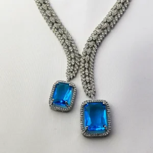American Diamond Silver Plated Doublet Stone Y Necklace & Earring Set, a true embodiment of elegance and glamour. This stunning AD Necklace Set is crafted with attention to detail, combining the timeless allure of Cubic Zirconia with the beauty of pendant in aqua crystal stone.