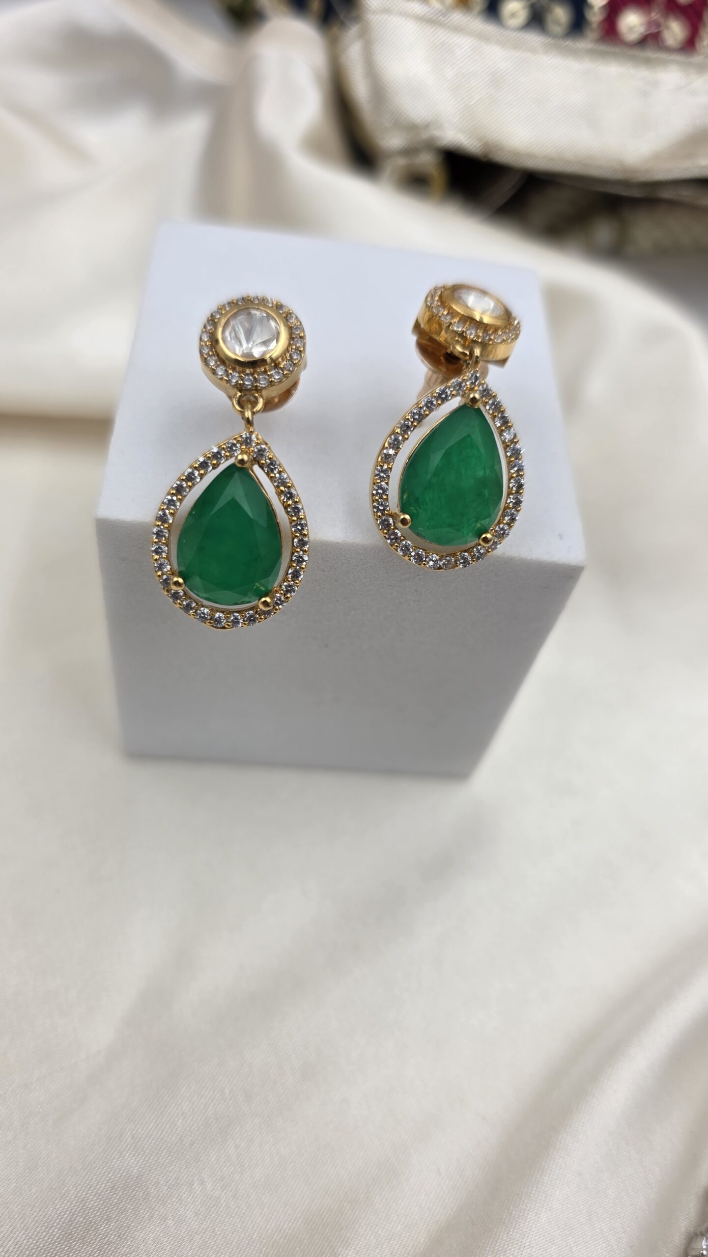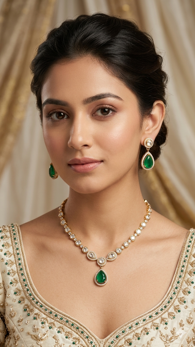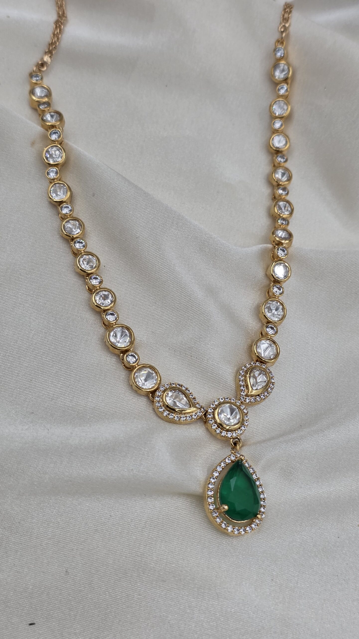 This Classic Moissanite Necklace with Stone is a eye catching piece of jewelry. It looks mazing with the brilliance of emerald stone, and the shining array of moissanite stones.