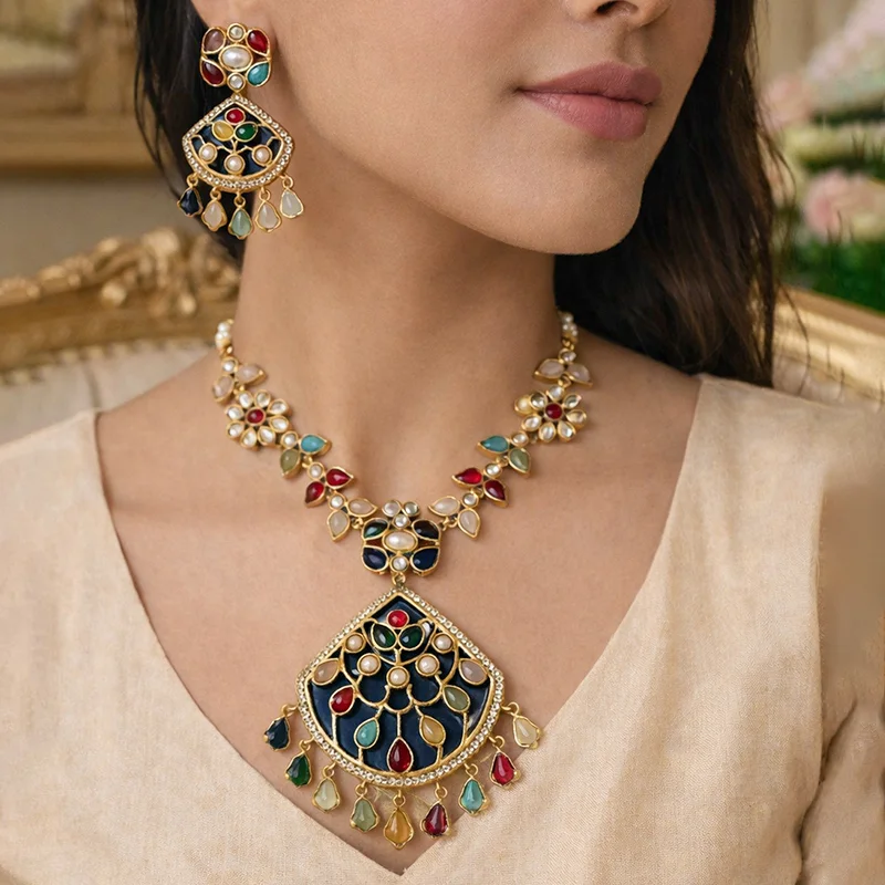 Multicolor Kundan necklace set is crafted with intricate detailing and adorned with vibrant red, green, blue, and golden stones. The bold pendant design is complemented with matching earrings, making it a complete set for festive occasions and weddings. Its floral and teardrop motifs add a regal charm, while the colorful stones ensure versatility with a wide range of traditional outfits.