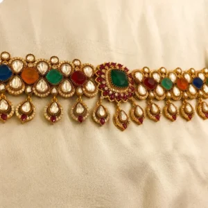 Multicolor Kundan Polki Choker Necklace Set, features a beautifully detailed choker adorned with vibrant multicolored stones, including rich green, deep red, royal blue, and warm amber tones.