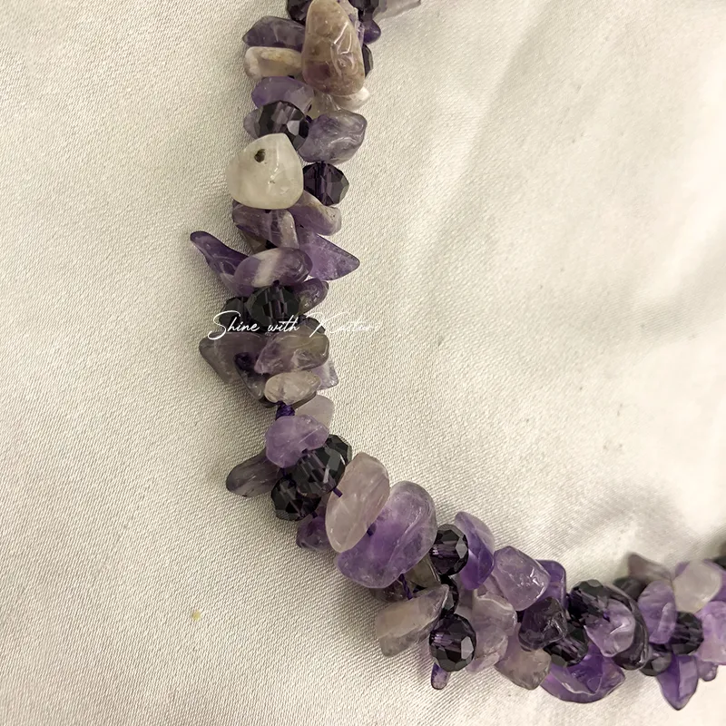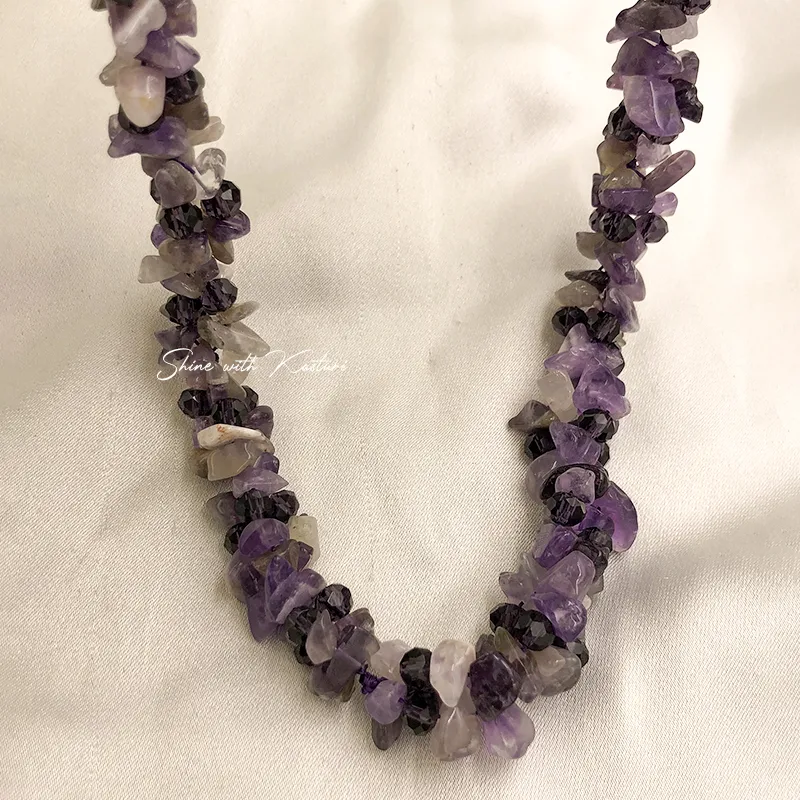 Natural Amethyst Chip Stone Necklace, designed to bring both beauty and balance to your look. Crafted with irregularly shaped amethyst chips, each piece showcases unique textures and shades of calming purple.