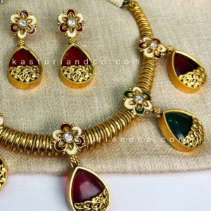 Embrace timeless elegance with this stunning Royal Heritage Kundan Set, featuring intricate gold-plated detailing and exquisite floral motifs. The set is adorned with rich green and red teardrop stones, symbolizing prosperity and tradition. Delicate pearl and beadwork enhance its regal charm, making it the perfect accessory for weddings, festive occasions, or traditional celebrations. Designed for those who appreciate classic craftsmanship, this set adds a touch of grandeur to any ensemble.