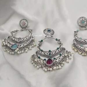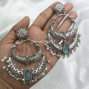 Make a bold style statement with these stunning Oxidized Silver Chandbali Earrings with Pearl Drops, designed to capture the essence of traditional Indian craftsmanship with a modern boho twist.
