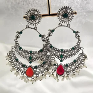 Featuring intricate filigree detailing, these earrings are adorned with delicate pearl drops that add graceful movement and charm. The vibrant multicolor stones—available in beautiful variations like turquoise, ruby, and pastel tones—enhance their unique appeal, making each pair a standout accessory. Perfect for festive occasions, weddings, or elevating your everyday ethnic look, these earrings blend elegance with artistic flair. Their lightweight design ensures comfort while maintaining a dramatic, eye-catching presence.
