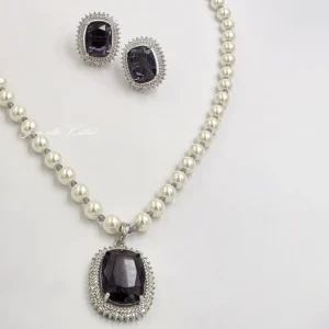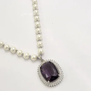 Pearl Necklace Set with Amethyst Pendant & Stud Earrings, designed to add a touch of sophistication to any outfit. The necklace is crafted with lustrous, high-quality pearls, beautifully arranged to create a timeless and graceful look.