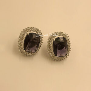 At the center, a striking deep purple amethyst-style pendant is framed with delicate shimmering stones, adding a luxurious sparkle. The set includes matching stud earrings that perfectly complement the pendant, making it ideal for coordinated styling.