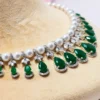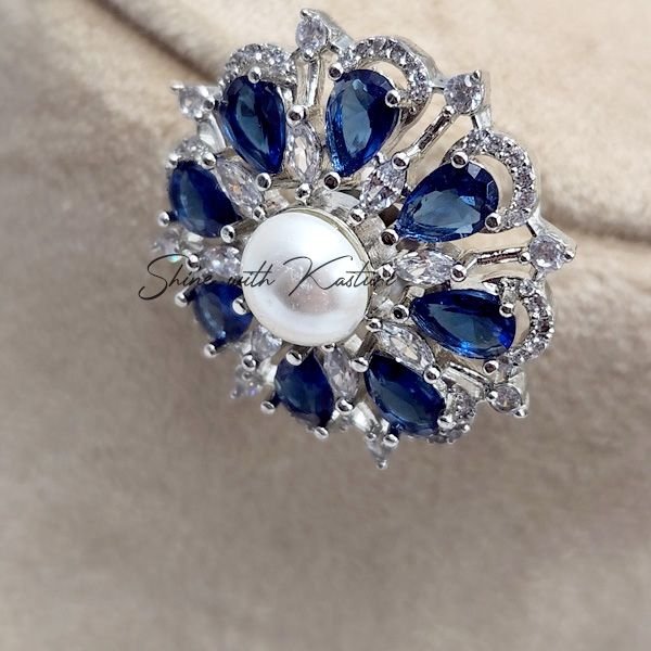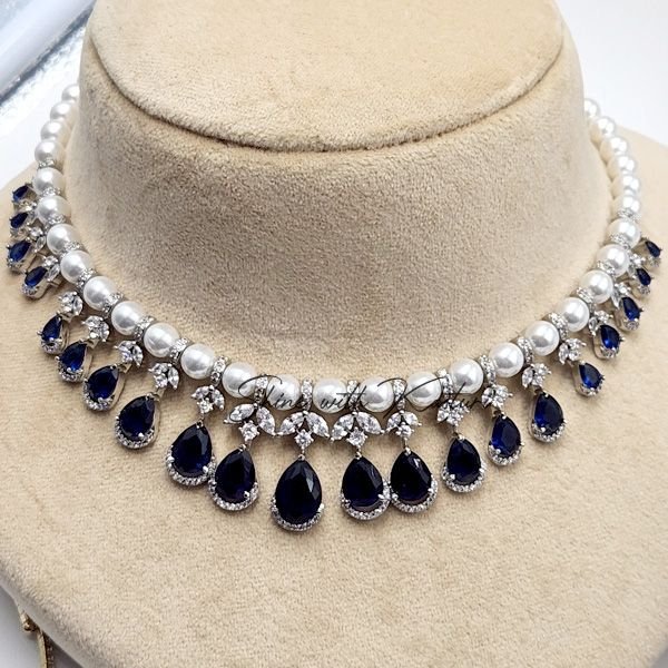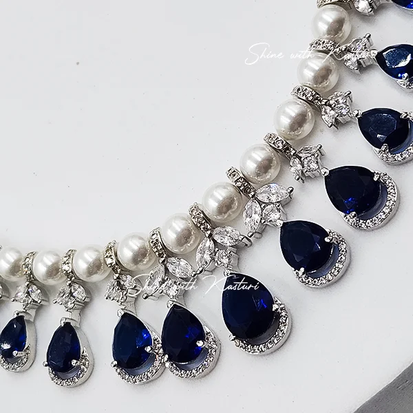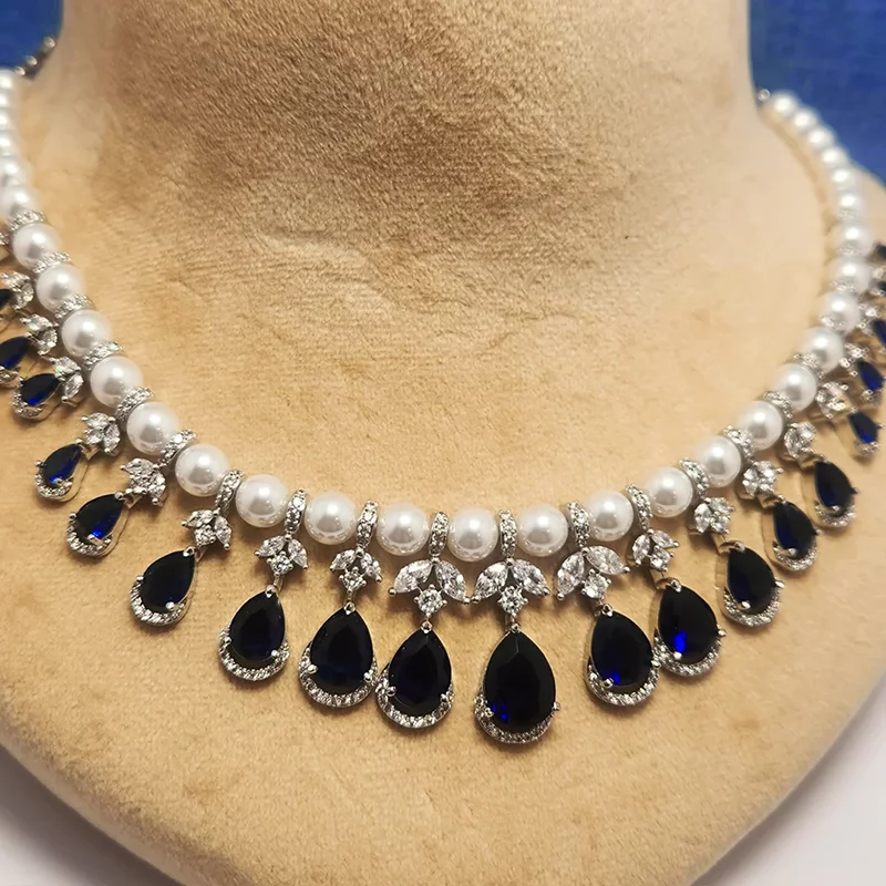 AD Layered Necklace is an elegant choker style adjustable AD Necklace with CZ, Pearls & Stones. This American Diamond Necklace is an impressive piece of jwellery with stunning combination of white pearls, blue colour stones and petal shaped rhinestones. The Pearls & Cubic Zirconia Layered Necklace has an extra ordinary design with brilliance to get you shining with your costume at any occasion.