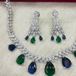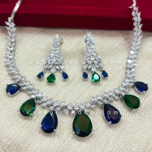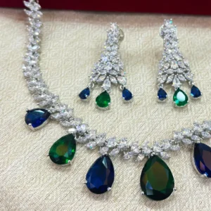 Perfect Evening Dress Necklace with alternating stones in peackock blue and green color. The rhodium polish and cubic zirconia complement the stones and overall look of the necklace set with earrings