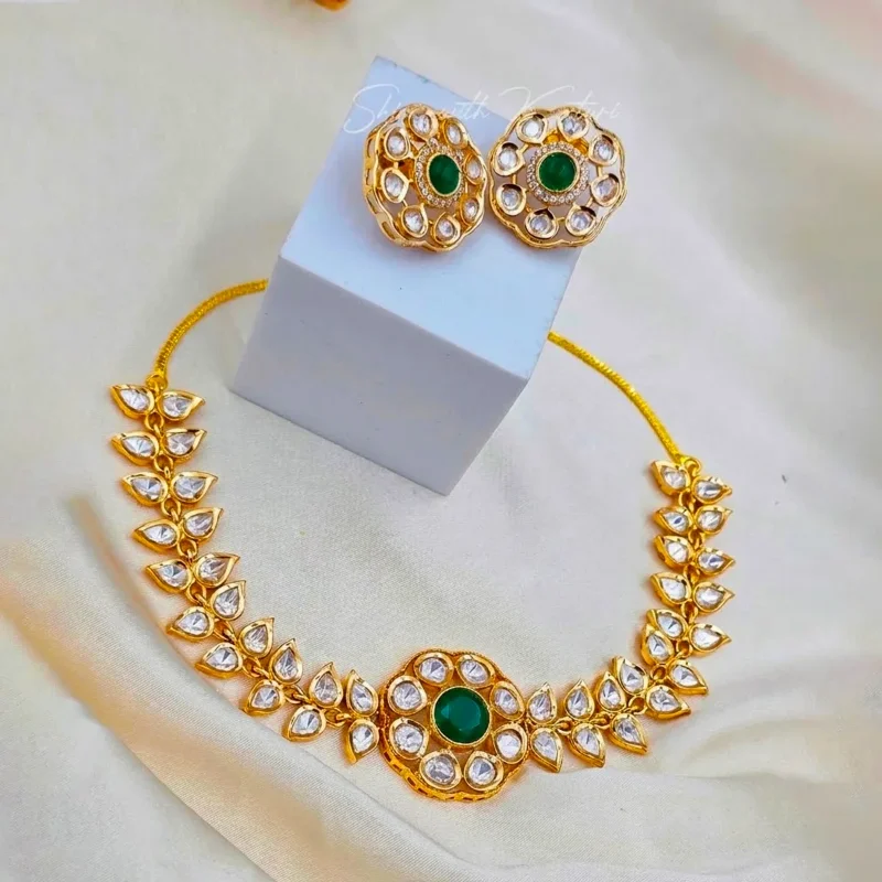 Polki Floral Necklace Set, Green with a luxurious gold finish, this exquisite necklace features sparkling Polki-style teardrop stones arranged in a graceful leaf pattern, creating a sophisticated and traditional look.