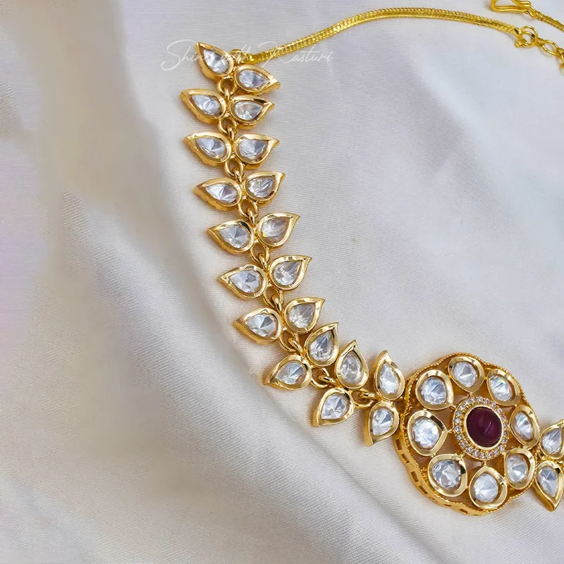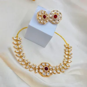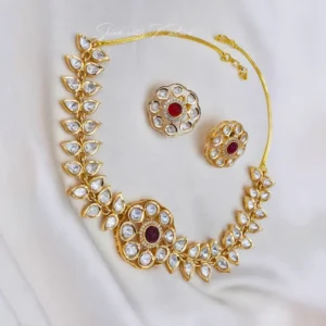 Polki Floral Necklace Set, Red with a luxurious gold finish, this exquisite necklace features sparkling Polki-style teardrop stones arranged in a graceful leaf pattern, creating a sophisticated and traditional look.