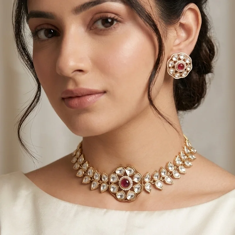 At the center sits a beautiful circular pendant with a rich ruby red stone, surrounded by shimmering stones that enhance its royal charm. The matching stud earrings with ruby center stones perfectly complement the necklace, completing the elegant set.
